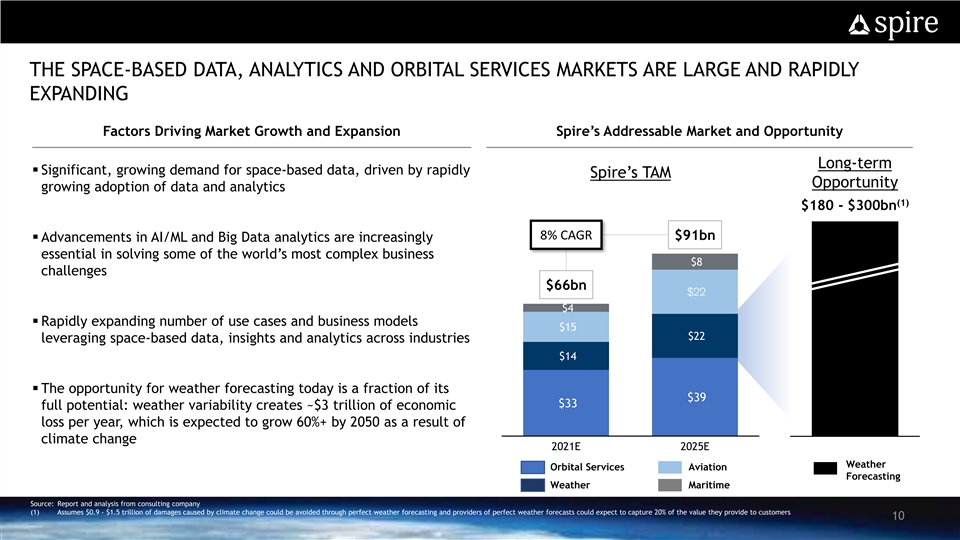 THE SPACE-BASED DATA, ANALYTICS AND ORBITAL SERVICES MARKETS ARE LARGE AND RAPIDLY EXPANDING Factors Driving Market Growth and Expansion Spire’s Addressable Market and Opportunity Long-term § Significant, growing demand for space-based data, driven by rapidly Spire’s TAM Opportunity growing adoption of data and analytics (1) $180 - $300bn 8% CAGR $91bn § Advancements in AI/ML and Big Data analytics are increasingly essential in solving some of the world’s most complex business $8 challenges $66bn $22 $4 § Rapidly expanding number of use cases and business models $15 $22 leveraging space-based data, insights and analytics across industries $14 § The opportunity for weather forecasting today is a fraction of its $39 $33 full potential: weather variability creates ~$3 trillion of economic loss per year, which is expected to grow 60%+ by 2050 as a result of climate change 2021E 2025E 2021E Weather Orbital Services Aviation Forecasting Weather Maritime Source: Report and analysis from consulting company (1) Assumes $0.9 - $1.5 trillion of damages caused by climate change could be avoided through perfect weather forecasting and providers of perfect weather forecasts could expect to capture 20% of the value they provide to customers 10THE SPACE-BASED DATA, ANALYTICS AND ORBITAL SERVICES MARKETS ARE LARGE AND RAPIDLY EXPANDING Factors Driving Market Growth and Expansion Spire’s Addressable Market and Opportunity Long-term § Significant, growing demand for space-based data, driven by rapidly Spire’s TAM Opportunity growing adoption of data and analytics (1) $180 - $300bn 8% CAGR $91bn § Advancements in AI/ML and Big Data analytics are increasingly essential in solving some of the world’s most complex business $8 challenges $66bn $22 $4 § Rapidly expanding number of use cases and business models $15 $22 leveraging space-based data, insights and analytics across industries $14 § The opportunity for weather forecasting today is a fraction of its $39 $33 full potential: weather variability creates ~$3 trillion of economic loss per year, which is expected to grow 60%+ by 2050 as a result of climate change 2021E 2025E 2021E Weather Orbital Services Aviation Forecasting Weather Maritime Source: Report and analysis from consulting company (1) Assumes $0.9 - $1.5 trillion of damages caused by climate change could be avoided through perfect weather forecasting and providers of perfect weather forecasts could expect to capture 20% of the value they provide to customers 10