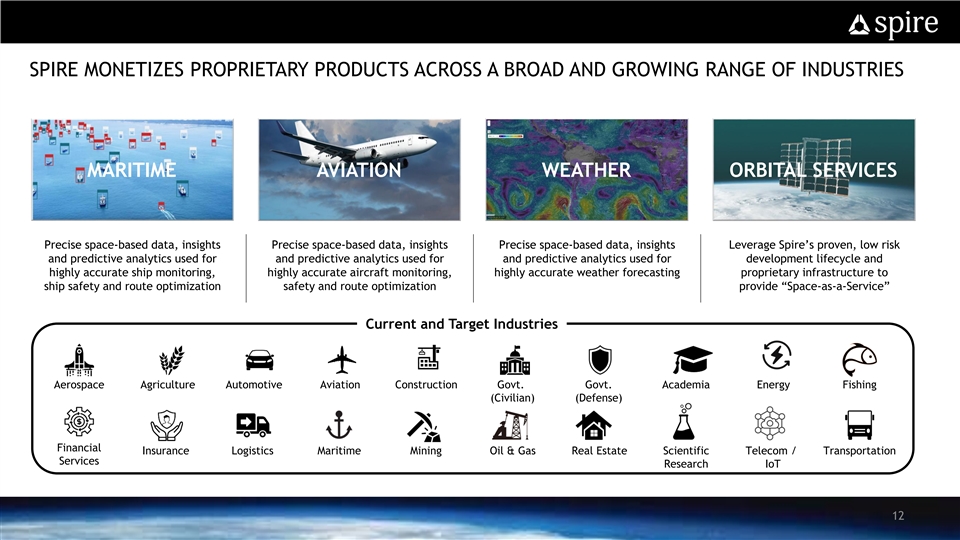 SPIRE TRANSFORMS PROPRIETARY DATA INTO VALUE-ADDED INSIGHTS AND PREDICTIVE ANALYTICS AI / ML / Proprietary Algorithms rd 3 Party Data Collect Once Sell Many Times LEMUR Clean Smart SpireSight Data Data API Clean and structured Clean data fused with Apply algorithms to data directly off rd 3 party datasets and fused data sets to Spire’s proprietary proprietary analysis to create predictive nanosats enhance value and analytics and insights provide insights Spire Collects Data from Space One Time and Can Sell it an Unlimited Number of Times 11SPIRE TRANSFORMS PROPRIETARY DATA INTO VALUE-ADDED INSIGHTS AND PREDICTIVE ANALYTICS AI / ML / Proprietary Algorithms rd 3 Party Data Collect Once Sell Many Times LEMUR Clean Smart SpireSight Data Data API Clean and structured Clean data fused with Apply algorithms to data directly off rd 3 party datasets and fused data sets to Spire’s proprietary proprietary analysis to create predictive nanosats enhance value and analytics and insights provide insights Spire Collects Data from Space One Time and Can Sell it an Unlimited Number of Times 11