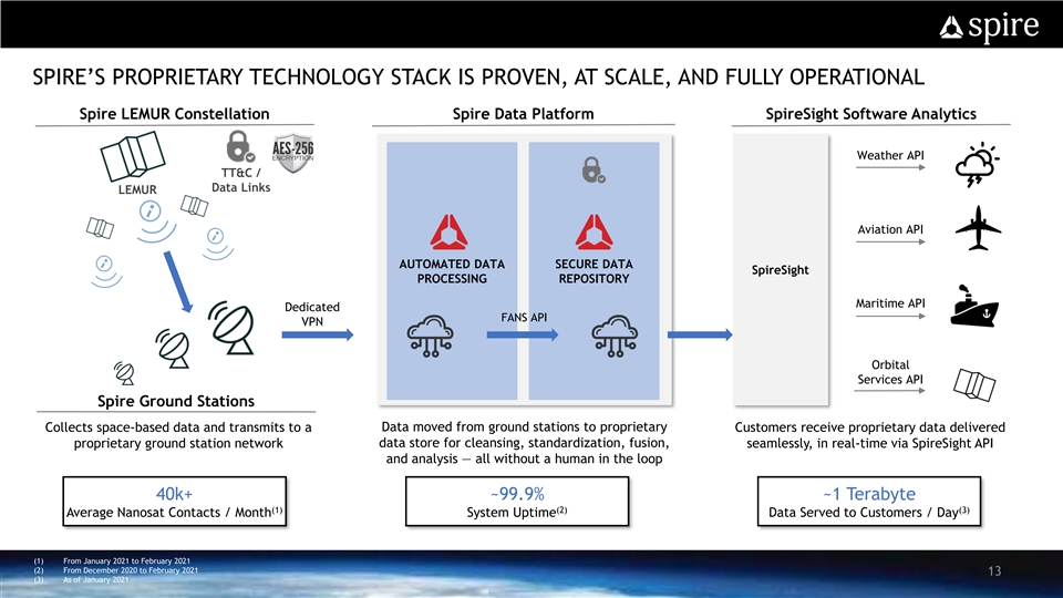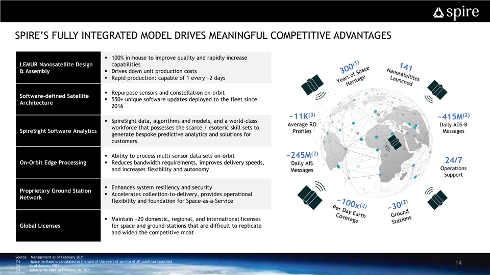 SPIRE’S PROPRIETARY TECHNOLOGY STACK IS PROVEN, AT SCALE, AND FULLY OPERATIONAL Spire LEMUR Constellation Spire Data Platform SpireSight Software Analytics Weather API TT&C / Data Links LEMUR Aviation API AUTOMATED DATA SECURE DATA SpireSight PROCESSING REPOSITORY Maritime API Dedicated FANS API VPN Orbital Services API Spire Ground Stations Collects space-based data and transmits to a Data moved from ground stations to proprietary Customers receive proprietary data delivered proprietary ground station network data store for cleansing, standardization, fusion, seamlessly, in real-time via SpireSight API and analysis — all without a human in the loop 40k+ ~99.9% ~1 Terabyte (1) (2) (3) Average Nanosat Contacts / Month System Uptime Data Served to Customers / Day (1) From January 2021 to February 2021 (2) From December 2020 to February 2021 13 (3) As of January 2021SPIRE’S PROPRIETARY TECHNOLOGY STACK IS PROVEN, AT SCALE, AND FULLY OPERATIONAL Spire LEMUR Constellation Spire Data Platform SpireSight Software Analytics Weather API TT&C / Data Links LEMUR Aviation API AUTOMATED DATA SECURE DATA SpireSight PROCESSING REPOSITORY Maritime API Dedicated FANS API VPN Orbital Services API Spire Ground Stations Collects space-based data and transmits to a Data moved from ground stations to proprietary Customers receive proprietary data delivered proprietary ground station network data store for cleansing, standardization, fusion, seamlessly, in real-time via SpireSight API and analysis — all without a human in the loop 40k+ ~99.9% ~1 Terabyte (1) (2) (3) Average Nanosat Contacts / Month System Uptime Data Served to Customers / Day (1) From January 2021 to February 2021 (2) From December 2020 to February 2021 13 (3) As of January 2021