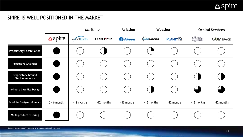 SPIRE’S FULLY INTEGRATED MODEL DRIVES MEANINGFUL COMPETITIVE ADVANTAGES § 100% in-house to improve quality and rapidly increase LEMUR Nanosatellite Design capabilities & Assembly§ Drives down unit production costs § Rapid production: capable of 1 every ~2 days § Repurpose sensors and constellation on-orbit Software-defined Satellite § 550+ unique software updates deployed to the fleet since Architecture 2016 (3) (2) ~11K ~415M § SpireSight data, algorithms and models, and a world-class Average RO Daily ADS-B workforce that possesses the scarce / esoteric skill sets to SpireSight Software Analytics Profiles Messages generate bespoke predictive analytics and solutions for customers (2) § Ability to process multi-sensor data sets on-orbit ~245M 24/7 On-Orbit Edge Processing§ Reduces bandwidth requirements, improves delivery speeds, Daily AIS Operations and increases flexibility and autonomy Messages Support § Enhances system resiliency and security Proprietary Ground Station § Accelerates collection-to-delivery, provides operational Network flexibility and foundation for Space-as-a-Service § Maintain ~20 domestic, regional, and international licenses Global Licenses for space and ground-stations that are difficult to replicate and widen the competitive moat Source: Management as of February 2021 (1) Space heritage is calculated as the sum of the years of service of all satellites launched 14 (2) As of January 2021 (3) January 16. 2021 to February 16, 2021SPIRE’S FULLY INTEGRATED MODEL DRIVES MEANINGFUL COMPETITIVE ADVANTAGES § 100% in-house to improve quality and rapidly increase LEMUR Nanosatellite Design capabilities & Assembly§ Drives down unit production costs § Rapid production: capable of 1 every ~2 days § Repurpose sensors and constellation on-orbit Software-defined Satellite § 550+ unique software updates deployed to the fleet since Architecture 2016 (3) (2) ~11K ~415M § SpireSight data, algorithms and models, and a world-class Average RO Daily ADS-B workforce that possesses the scarce / esoteric skill sets to SpireSight Software Analytics Profiles Messages generate bespoke predictive analytics and solutions for customers (2) § Ability to process multi-sensor data sets on-orbit ~245M 24/7 On-Orbit Edge Processing§ Reduces bandwidth requirements, improves delivery speeds, Daily AIS Operations and increases flexibility and autonomy Messages Support § Enhances system resiliency and security Proprietary Ground Station § Accelerates collection-to-delivery, provides operational Network flexibility and foundation for Space-as-a-Service § Maintain ~20 domestic, regional, and international licenses Global Licenses for space and ground-stations that are difficult to replicate and widen the competitive moat Source: Management as of February 2021 (1) Space heritage is calculated as the sum of the years of service of all satellites launched 14 (2) As of January 2021 (3) January 16. 2021 to February 16, 2021