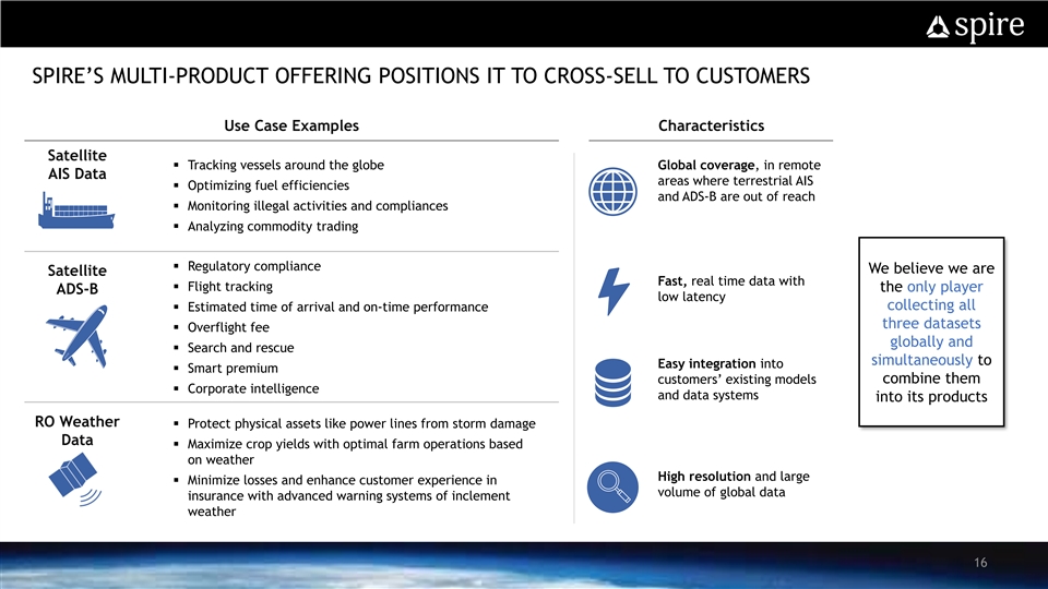SPIRE IS WELL POSITIONED IN THE MARKET Maritime Aviation Weather Orbital Services Proprietary Constellation Predictive Analytics Proprietary Ground Station Network In-house Satellite Design Satellite Design-to-Launch 3 – 6 months >12 months >12 months >12 months >12 months >12 months >12 months >12 months Multi-product Offering Source: Management’s competitive assessment of each company 15SPIRE IS WELL POSITIONED IN THE MARKET Maritime Aviation Weather Orbital Services Proprietary Constellation Predictive Analytics Proprietary Ground Station Network In-house Satellite Design Satellite Design-to-Launch 3 – 6 months >12 months >12 months >12 months >12 months >12 months >12 months >12 months Multi-product Offering Source: Management’s competitive assessment of each company 15