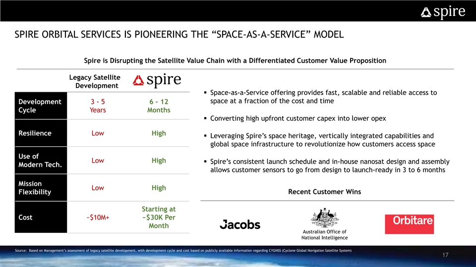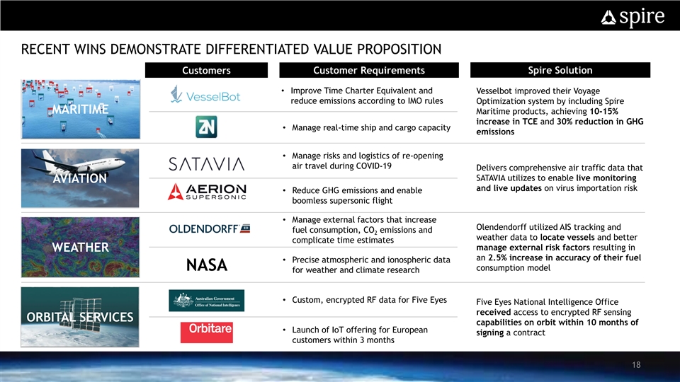 SPIRE ORBITAL SERVICES IS PIONEERING THE “SPACE-AS-A-SERVICE” MODEL Spire is Disrupting the Satellite Value Chain with a Differentiated Customer Value Proposition Legacy Satellite Development § Space-as-a-Service offering provides fast, scalable and reliable access to space at a fraction of the cost and time Development 3 - 5 6 – 12 Cycle Years Months § Converting high upfront customer capex into lower opex Resilience Low High § Leveraging Spire’s space heritage, vertically integrated capabilities and global space infrastructure to revolutionize how customers access space Use of Low High § Spire’s consistent launch schedule and in-house nanosat design and assembly Modern Tech. allows customer sensors to go from design to launch-ready in 3 to 6 months Mission Low High Flexibility Recent Customer Wins Starting at Cost ~$10M+ ~$30K Per Month Australian Office of National Intelligence Source: Based on Management’s assessment of legacy satellite development, with development cycle and cost based on publicly available information regarding CYGNSS (Cyclone Global Navigation Satellite System) 17SPIRE ORBITAL SERVICES IS PIONEERING THE “SPACE-AS-A-SERVICE” MODEL Spire is Disrupting the Satellite Value Chain with a Differentiated Customer Value Proposition Legacy Satellite Development § Space-as-a-Service offering provides fast, scalable and reliable access to space at a fraction of the cost and time Development 3 - 5 6 – 12 Cycle Years Months § Converting high upfront customer capex into lower opex Resilience Low High § Leveraging Spire’s space heritage, vertically integrated capabilities and global space infrastructure to revolutionize how customers access space Use of Low High § Spire’s consistent launch schedule and in-house nanosat design and assembly Modern Tech. allows customer sensors to go from design to launch-ready in 3 to 6 months Mission Low High Flexibility Recent Customer Wins Starting at Cost ~$10M+ ~$30K Per Month Australian Office of National Intelligence Source: Based on Management’s assessment of legacy satellite development, with development cycle and cost based on publicly available information regarding CYGNSS (Cyclone Global Navigation Satellite System) 17