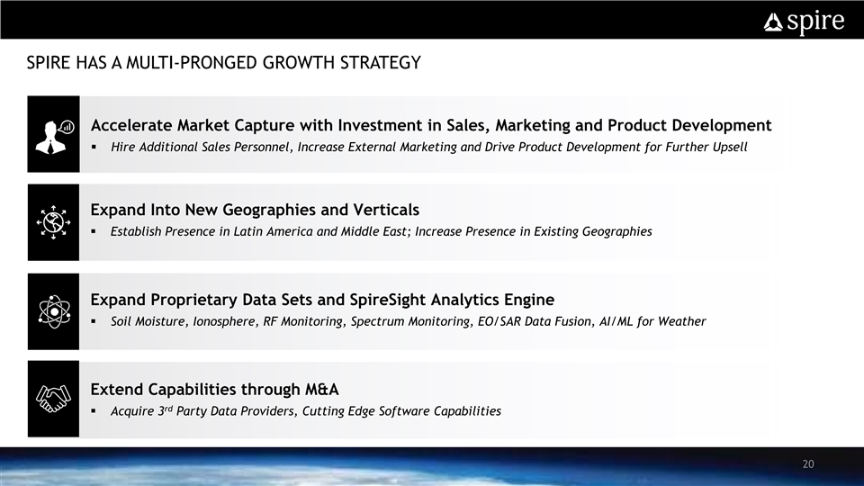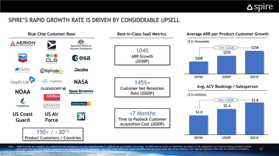 SPIRE’S RAPID GROWTH RATE IS DRIVEN BY CONSIDERABLE UPSELL Blue Chip Customer Base Best-in-Class SaaS Metrics Average ARR per Product Customer Growth ($ in thousands) Australian Office of $258 11% CAGR National Intelligence 104% $235 ARR Growth $208 (2020P) 2019A 2020P 2021E NASA 145%+ Avg. ACV Bookings / Salesperson Customer Net Retention NOAA Rate (2020P) ($ in millions) 16% CAGR $2.8 $2.4 $2.0 <7 Months US Coast US Air Time to Payback Customer Guard Force Acquisition Cost (2020P) (1) 150+ / ~30 2019A 2020P 2021E Product Customers / Countries Note: 2020P financials are unaudited. Our audited financial statements for our year ended December 31, 2020 are not yet available. Accordingly, the 2020 financial results are preliminary and subject to the completion of our financial closing procedures and any adjustments that may result from the completion of the audits of our financial statements. As a result, these preliminary results may differ from the actual results that will be reflected in our financial statements when they are completed and publicly 19 disclosed. These preliminary results may change and any change may be material (1) As of February 2021SPIRE’S RAPID GROWTH RATE IS DRIVEN BY CONSIDERABLE UPSELL Blue Chip Customer Base Best-in-Class SaaS Metrics Average ARR per Product Customer Growth ($ in thousands) Australian Office of $258 11% CAGR National Intelligence 104% $235 ARR Growth $208 (2020P) 2019A 2020P 2021E NASA 145%+ Avg. ACV Bookings / Salesperson Customer Net Retention NOAA Rate (2020P) ($ in millions) 16% CAGR $2.8 $2.4 $2.0 <7 Months US Coast US Air Time to Payback Customer Guard Force Acquisition Cost (2020P) (1) 150+ / ~30 2019A 2020P 2021E Product Customers / Countries Note: 2020P financials are unaudited. Our audited financial statements for our year ended December 31, 2020 are not yet available. Accordingly, the 2020 financial results are preliminary and subject to the completion of our financial closing procedures and any adjustments that may result from the completion of the audits of our financial statements. As a result, these preliminary results may differ from the actual results that will be reflected in our financial statements when they are completed and publicly 19 disclosed. These preliminary results may change and any change may be material (1) As of February 2021