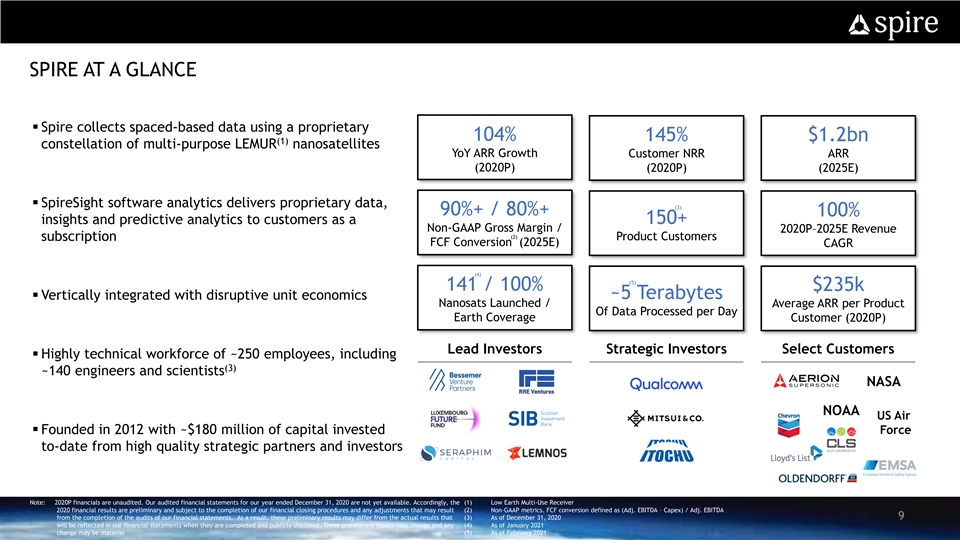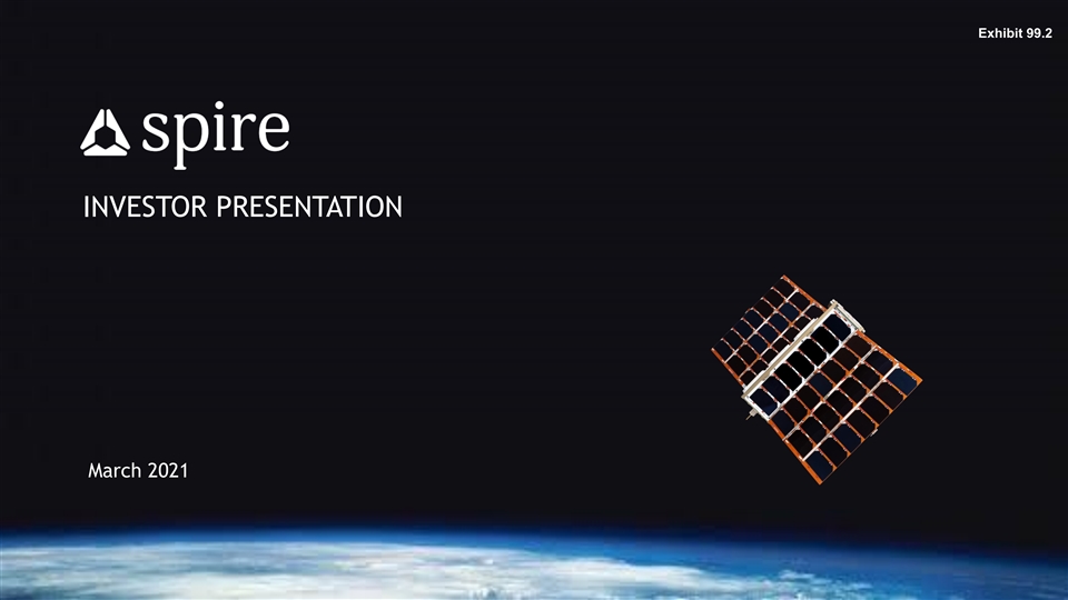 SPIRE AT A GLANCE DISCLAIMER AND FORWARD LOOKING STATEMENTS § Spire collects spaced-based data using a proprietary 104% 145% $1.2bn (1) constellation of multi-purpose LEMUR nanosatellites YoY ARR Growth Customer NRR ARR (2020P) (2020P) (2025E) § SpireSight software analytics delivers proprietary data, (3) 90%+ / 80%+ 100% insights and predictive analytics to customers as a 150+ Non-GAAP Gross Margin / 2020P–2025E Revenue (2) Product Customers subscription FCF Conversion (2025E) CAGR (4) (5) 141 / 100% $235k ~5 Terabytes § Vertically integrated with disruptive unit economics Nanosats Launched / Average ARR per Product Of Data Processed per Day Earth Coverage Customer (2020P) Lead Investors Strategic Investors Select Customers § Highly technical workforce of ~250 employees, including (3) ~140 engineers and scientists NASA NOAA US Air § Founded in 2012 with ~$180 million of capital invested Force to-date from high quality strategic partners and investors Note: 2020P financials are unaudited. Our audited financial statements for our year ended December 31, 2020 are not yet available. Accordingly, the (1) Low Earth Multi-Use Receiver 2020 financial results are preliminary and subject to the completion of our financial closing procedures and any adjustments that may result (2) Non-GAAP metrics. FCF conversion defined as (Adj. EBITDA – Capex) / Adj. EBITDA from the completion of the audits of our financial statements. As a result, these preliminary results may differ from the actual results that (3) As of December 31, 2020 9 will be reflected in our financial statements when they are completed and publicly disclosed. These preliminary results may change and any (4) As of January 2021 change may be material (5) As of February 2021SPIRE AT A GLANCE DISCLAIMER AND FORWARD LOOKING STATEMENTS § Spire collects spaced-based data using a proprietary 104% 145% $1.2bn (1) constellation of multi-purpose LEMUR nanosatellites YoY ARR Growth Customer NRR ARR (2020P) (2020P) (2025E) § SpireSight software analytics delivers proprietary data, (3) 90%+ / 80%+ 100% insights and predictive analytics to customers as a 150+ Non-GAAP Gross Margin / 2020P–2025E Revenue (2) Product Customers subscription FCF Conversion (2025E) CAGR (4) (5) 141 / 100% $235k ~5 Terabytes § Vertically integrated with disruptive unit economics Nanosats Launched / Average ARR per Product Of Data Processed per Day Earth Coverage Customer (2020P) Lead Investors Strategic Investors Select Customers § Highly technical workforce of ~250 employees, including (3) ~140 engineers and scientists NASA NOAA US Air § Founded in 2012 with ~$180 million of capital invested Force to-date from high quality strategic partners and investors Note: 2020P financials are unaudited. Our audited financial statements for our year ended December 31, 2020 are not yet available. Accordingly, the (1) Low Earth Multi-Use Receiver 2020 financial results are preliminary and subject to the completion of our financial closing procedures and any adjustments that may result (2) Non-GAAP metrics. FCF conversion defined as (Adj. EBITDA – Capex) / Adj. EBITDA from the completion of the audits of our financial statements. As a result, these preliminary results may differ from the actual results that (3) As of December 31, 2020 9 will be reflected in our financial statements when they are completed and publicly disclosed. These preliminary results may change and any (4) As of January 2021 change may be material (5) As of February 2021