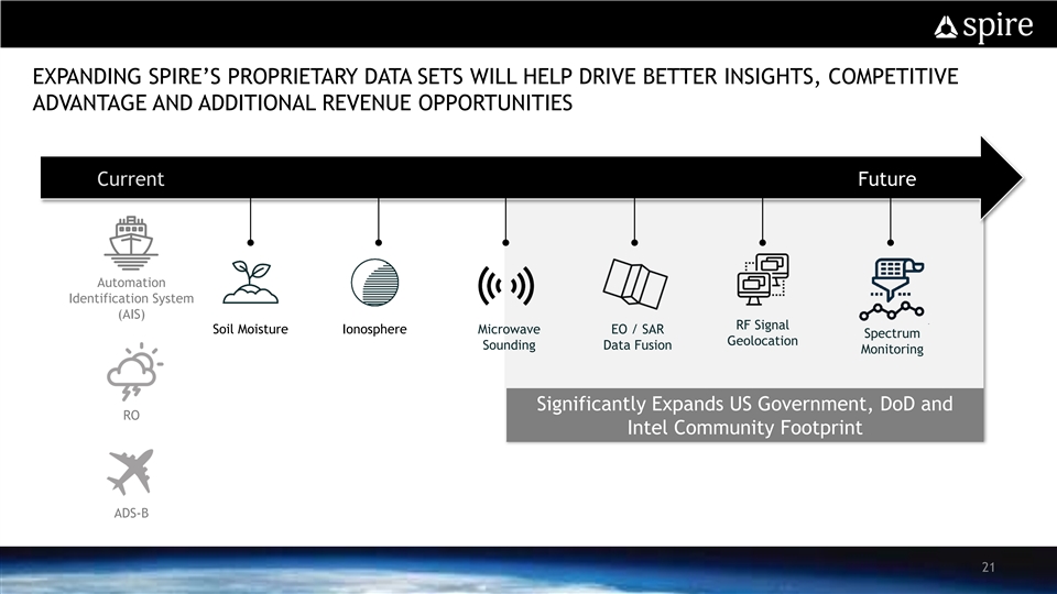SPIRE HAS A MULTI-PRONGED GROWTH STRATEGY Accelerate Market Capture with Investment in Sales, Marketing and Product Development § Hire Additional Sales Personnel, Increase External Marketing and Drive Product Development for Further Upsell Expand Into New Geographies and Verticals § Establish Presence in Latin America and Middle East; Increase Presence in Existing Geographies Expand Proprietary Data Sets and SpireSight Analytics Engine § Soil Moisture, Ionosphere, RF Monitoring, Spectrum Monitoring, EO/SAR Data Fusion, AI/ML for Weather Extend Capabilities through M&A rd § Acquire 3 Party Data Providers, Cutting Edge Software Capabilities 20SPIRE HAS A MULTI-PRONGED GROWTH STRATEGY Accelerate Market Capture with Investment in Sales, Marketing and Product Development § Hire Additional Sales Personnel, Increase External Marketing and Drive Product Development for Further Upsell Expand Into New Geographies and Verticals § Establish Presence in Latin America and Middle East; Increase Presence in Existing Geographies Expand Proprietary Data Sets and SpireSight Analytics Engine § Soil Moisture, Ionosphere, RF Monitoring, Spectrum Monitoring, EO/SAR Data Fusion, AI/ML for Weather Extend Capabilities through M&A rd § Acquire 3 Party Data Providers, Cutting Edge Software Capabilities 20