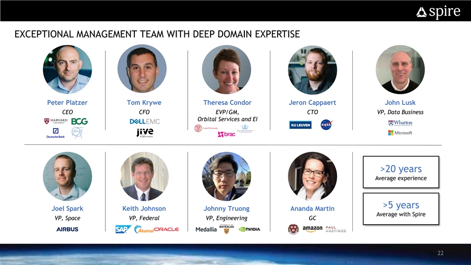 EXPANDING SPIRE’S PROPRIETARY DATA SETS WILL HELP DRIVE BETTER INSIGHTS, COMPETITIVE ADVANTAGE AND ADDITIONAL REVENUE OPPORTUNITIES Current Future Automation Identification System (AIS) RF Signal Soil Moisture Ionosphere Microwave EO / SAR Spectrum Geolocation Sounding Data Fusion Monitoring Significantly Expands US Government, DoD and RO Intel Community Footprint ADS-B 21EXPANDING SPIRE’S PROPRIETARY DATA SETS WILL HELP DRIVE BETTER INSIGHTS, COMPETITIVE ADVANTAGE AND ADDITIONAL REVENUE OPPORTUNITIES Current Future Automation Identification System (AIS) RF Signal Soil Moisture Ionosphere Microwave EO / SAR Spectrum Geolocation Sounding Data Fusion Monitoring Significantly Expands US Government, DoD and RO Intel Community Footprint ADS-B 21