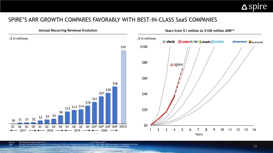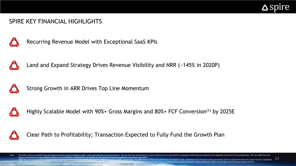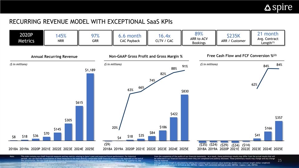 SPIRE KEY FINANCIAL HIGHLIGHTS Recurring Revenue Model with Exceptional SaaS KPIs Land and Expand Strategy Drives Revenue Visibility and NRR (~145% in 2020P) Strong Growth in ARR Drives Top Line Momentum (1) Highly Scalable Model with 90%+ Gross Margins and 80%+ FCF Conversion by 2025E Clear Path to Profitability; Transaction Expected to Fully Fund the Growth Plan Note: This slide contains non-GAAP financial measures and key metrics relating to Spire’s past and expected future performance. You can find the reconciliation of these measures to the most directly comparable GAAP financial measure in the Appendix at the end of this presentation. The non-GAAP financial measures disclosed in this presentation should not be considered a substitute for, or superior to, the financial measures prepared in accordance with GAAP 24 2020P financials are unaudited. Our audited financial statements for our year ended December 31, 2020 are not yet available. Accordingly, the 2020 financial results are preliminary and subject to the completion of our financial closing procedures and any adjustments that may result from the completion of the audits of our financial statements. As a result, these preliminary results may differ from the actual results that will be reflected in our financial statements when they are completed and publicly disclosed. These preliminary results may change and any change may be material (1) FCF is a non-GAAP measure defined as Adj. EBITDA - Capex. FCF conversion defined as (Adj. EBITDA – Capex) / Adj. EBITDASPIRE KEY FINANCIAL HIGHLIGHTS Recurring Revenue Model with Exceptional SaaS KPIs Land and Expand Strategy Drives Revenue Visibility and NRR (~145% in 2020P) Strong Growth in ARR Drives Top Line Momentum (1) Highly Scalable Model with 90%+ Gross Margins and 80%+ FCF Conversion by 2025E Clear Path to Profitability; Transaction Expected to Fully Fund the Growth Plan Note: This slide contains non-GAAP financial measures and key metrics relating to Spire’s past and expected future performance. You can find the reconciliation of these measures to the most directly comparable GAAP financial measure in the Appendix at the end of this presentation. The non-GAAP financial measures disclosed in this presentation should not be considered a substitute for, or superior to, the financial measures prepared in accordance with GAAP 24 2020P financials are unaudited. Our audited financial statements for our year ended December 31, 2020 are not yet available. Accordingly, the 2020 financial results are preliminary and subject to the completion of our financial closing procedures and any adjustments that may result from the completion of the audits of our financial statements. As a result, these preliminary results may differ from the actual results that will be reflected in our financial statements when they are completed and publicly disclosed. These preliminary results may change and any change may be material (1) FCF is a non-GAAP measure defined as Adj. EBITDA - Capex. FCF conversion defined as (Adj. EBITDA – Capex) / Adj. EBITDA