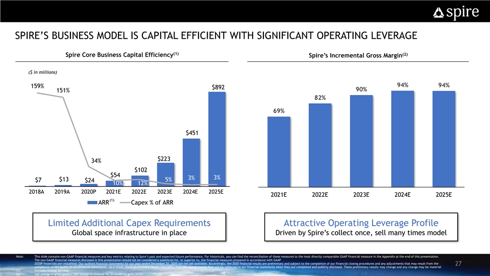 SPIRE’S BUSINESS MODEL IS CAPITAL EFFICIENT WITH SIGNIFICANT OPERATING LEVERAGE (1) (2) Spire Core Business Capital Efficiency Spire’s Incremental Gross Margin ($ in millions) 180% 94% 94% 159% $892 90% 151% 160% 82% 140% 69% 120% 100% $451 80% 60% $223 34% 40% $102 20% $54 3% 3% $13 5% $7 $24 10% 12% 0% 2018A 2019A 2020P 2021E 2022E 2023E 2024E 2025E 2021E 2022E 2023E 2024E 2025E (1) ARR Capex % of ARR Limited Additional Capex Requirements Attractive Operating Leverage Profile Global space infrastructure in place Driven by Spire’s collect once, sell many times model Note: This slide contains non-GAAP financial measures and key metrics relating to Spire’s past and expected future performance. For historicals, you can find the reconciliation of these measures to the most directly comparable GAAP financial measure in the Appendix at the end of this presentation. The non-GAAP financial measures disclosed in this presentation should not be considered a substitute for, or superior to, the financial measures prepared in accordance with GAAP 2020P financials are unaudited. Our audited financial statements for our year ended December 31, 2020 are not yet available. Accordingly, the 2020 financial results are preliminary and subject to the completion of our financial closing procedures and any adjustments that may result from the 27 completion of the audits of our financial statements. As a result, these preliminary results may differ from the actual results that will be reflected in our financial statements when they are completed and publicly disclosed. These preliminary results may change and any change may be material (1) Excludes Orbital Services (2) YoY change in gross profit / YoY change in revenue for incremental gross profitSPIRE’S BUSINESS MODEL IS CAPITAL EFFICIENT WITH SIGNIFICANT OPERATING LEVERAGE (1) (2) Spire Core Business Capital Efficiency Spire’s Incremental Gross Margin ($ in millions) 180% 94% 94% 159% $892 90% 151% 160% 82% 140% 69% 120% 100% $451 80% 60% $223 34% 40% $102 20% $54 3% 3% $13 5% $7 $24 10% 12% 0% 2018A 2019A 2020P 2021E 2022E 2023E 2024E 2025E 2021E 2022E 2023E 2024E 2025E (1) ARR Capex % of ARR Limited Additional Capex Requirements Attractive Operating Leverage Profile Global space infrastructure in place Driven by Spire’s collect once, sell many times model Note: This slide contains non-GAAP financial measures and key metrics relating to Spire’s past and expected future performance. For historicals, you can find the reconciliation of these measures to the most directly comparable GAAP financial measure in the Appendix at the end of this presentation. The non-GAAP financial measures disclosed in this presentation should not be considered a substitute for, or superior to, the financial measures prepared in accordance with GAAP 2020P financials are unaudited. Our audited financial statements for our year ended December 31, 2020 are not yet available. Accordingly, the 2020 financial results are preliminary and subject to the completion of our financial closing procedures and any adjustments that may result from the 27 completion of the audits of our financial statements. As a result, these preliminary results may differ from the actual results that will be reflected in our financial statements when they are completed and publicly disclosed. These preliminary results may change and any change may be material (1) Excludes Orbital Services (2) YoY change in gross profit / YoY change in revenue for incremental gross profit