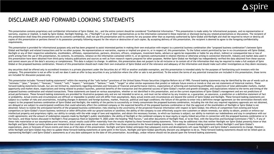 DISCLAIMER AND FORWARD–LOOKING STATEMENTS DISCLAIMER AND FORWARD LOOKING STATEMENTS This presentation contains proprietary and confidential information of Spire Global, Inc., and the entire content should be considered “Confidential Information.” This presentation is made solely for informational purposes, and no representation or warranty, express or implied, is made by Spire Global, NavSight Holdings, Inc. (“NavSight”) or any of their representatives as to the information contained in these materials or disclosed during any related presentations or discussions. The recipient of this presentation shall keep this presentation and its contents confidential, shall not use this presentation and its contents for any purpose other than as expressly authorized by Spire Global and NavSight and shall be required to return or destroy all copies of this presentation or portions thereof in its possession promptly following request for the return or destruction of such copies. By accepting delivery of this presentation, the recipient is deemed to agree to the foregoing confidentiality requirements. This presentation is provided for informational purposes only and has been prepared to assist interested parties in making their own evaluation with respect to a potential business combination (the “proposed business combination”) between Spire Global and NavSight and related transactions and for no other purpose. No representations or warranties, express or implied are given in, or in respect of, this presentation. To the fullest extent permitted by law in no circumstances will Spire Global, NavSight or any of their respective subsidiaries, stockholders, affiliates, representatives, partners, directors, officers, employees, investment banks, advisers or agents be responsible or liable for any direct, indirect or consequential loss or loss of profit arising from the use of this presentation, its contents, its omissions, reliance on the information contained within it, or on opinions communicated in relation thereto or otherwise arising in connection therewith. Industry and market data used in this presentation have been obtained from third-party industry publications and sources as well as from research reports prepared for other purposes. Neither Spire Global nor NavSight has independently verified the data obtained from these sources and cannot assure you of the data’s accuracy or completeness. This data is subject to change. In addition, this presentation does not purport to be all-inclusive or to contain all of the information that may be required to make a full analysis of Spire Global or the proposed business combination. Viewers of this presentation should each make their own evaluation of Spire Global and of the relevance and adequacy of the information and should make such other investigations as they deem necessary. Any securities shall be offered only to accredited investors in a private placement under the Securities Act of 1933 or another available exemption, and this presentation is intended solely for the purposes of familiarizing such investors with the company. This presentation is not an offer to sell nor does it seek an offer to buy securities in any jurisdiction where the offer or sale is not permitted. To the extent the terms of any potential transaction are included in this presentation, those terms are included for discussion purposes only. This presentation includes “forward-looking statements” within the meaning of the “safe harbor” provisions of the United States Private Securities Litigation Reform Act of 1995. Forward-looking statements may be identified by the use of words such as “estimate,” “plan,” “project,” “forecast,” “intend,” “will,” “expect,” “anticipate,” “believe,” “seek,” “target” or other similar expressions that predict or indicate future events or trends or that are not statements of historical matters. These forward-looking statements include, but are not limited to, statements regarding estimates and forecasts of financial and performance metrics, expectations of achieving and maintaining profitability, projections of total addressable markets, market opportunity and market share, expectations and timing related to product launches, potential benefits of the transaction and the potential success of Spire Global’s market and growth strategies, and expectations related to the terms and timing of the proposed business combination and related transactions. These statements are based on various assumptions, whether or not identified in this presentation, and on the current expectations of Spire Global’s management and are not predictions of actual performance. These forward-looking statements are provided for illustrative purposes only and are not intended to serve as, and must not be relied on by any investor as, a guarantee, an assurance, a prediction or a definitive statement of fact or probability. Actual events and circumstances are difficult or impossible to predict and will differ from assumptions. Many actual events and circumstances are beyond the control of Spire Global and NavSight. These forward-looking statements are subject to a number of risks and uncertainties, including changes in domestic and foreign business, market, financial, political and legal conditions; the failure of the parties to enter into a definitive merger agreement (or the termination thereof) with respect to the proposed business combination of Spire Global and NavSight; the inability of the parties to successfully or timely consummate the proposed business combination, including the risk that any required regulatory approvals are not obtained, are delayed or are subject to unanticipated conditions that could adversely affect the combined company or the expected benefits of the proposed business combination or that the approval of the stockholders of NavSight or Spire Global is not obtained; failure to realize t