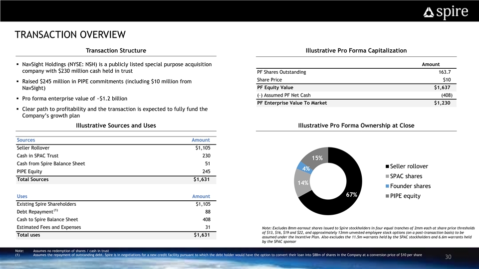 TRANSACTION OVERVIEW DISCLAIMER AND FORWARD LOOKING STATEMENTS Transaction Structure Illustrative Pro Forma Capitalization § NavSight Holdings (NYSE: NSH) is a publicly listed special purpose acquisition Amount company with $230 million cash held in trust PF Shares Outstanding 163.7 Share Price $10 § Raised $245 million in PIPE commitments (including $10 million from PF Equity Value $1,637 NavSight) (–) Assumed PF Net Cash (408) § Pro forma enterprise value of ~$1.2 billion PF Enterprise Value To Market $1,230 § Clear path to profitability and the transaction is expected to fully fund the Company’s growth plan Illustrative Sources and Uses Illustrative Pro Forma Ownership at Close Sources Amount Seller Rollover $1,105 Cash in SPAC Trust 230 15% Cash from Spire Balance Sheet 51 Seller rollover 4% PIPE Equity 245 SPAC shares Total Sources $1,631 14% Founder shares 67% PIPE equity Uses Amount Existing Spire Shareholders $1,105 (1) Debt Repayment 88 Cash to Spire Balance Sheet 408 Estimated Fees and Expenses 31 Note: Excludes 8mm earnout shares issued to Spire stockholders in four equal tranches of 2mm each at share price thresholds of $13, $16, $19 and $22, and approximately 13mm unvested employee stock options (on a post-transaction basis) to be Total uses $1,631 assumed under the Incentive Plan. Also excludes the 11.5m warrants held by the SPAC stockholders and 6.6m warrants held by the SPAC sponsor Note: Assumes no redemption of shares / cash in trust (1) Assumes the repayment of outstanding debt. Spire is in negotiations for a new credit facility pursuant to which the debt holder would have the option to convert their loan into $88m of shares in the Company at a conversion price of $10 per share 30TRANSACTION OVERVIEW DISCLAIMER AND FORWARD LOOKING STATEMENTS Transaction Structure Illustrative Pro Forma Capitalization § NavSight Holdings (NYSE: NSH) is a publicly listed special purpose acquisition Amount company with $230 million cash held in trust PF Shares Outstanding 163.7 Share Price $10 § Raised $245 million in PIPE commitments (including $10 million from PF Equity Value $1,637 NavSight) (–) Assumed PF Net Cash (408) § Pro forma enterprise value of ~$1.2 billion PF Enterprise Value To Market $1,230 § Clear path to profitability and the transaction is expected to fully fund the Company’s growth plan Illustrative Sources and Uses Illustrative Pro Forma Ownership at Close Sources Amount Seller Rollover $1,105 Cash in SPAC Trust 230 15% Cash from Spire Balance Sheet 51 Seller rollover 4% PIPE Equity 245 SPAC shares Total Sources $1,631 14% Founder shares 67% PIPE equity Uses Amount Existing Spire Shareholders $1,105 (1) Debt Repayment 88 Cash to Spire Balance Sheet 408 Estimated Fees and Expenses 31 Note: Excludes 8mm earnout shares issued to Spire stockholders in four equal tranches of 2mm each at share price thresholds of $13, $16, $19 and $22, and approximately 13mm unvested employee stock options (on a post-transaction basis) to be Total uses $1,631 assumed under the Incentive Plan. Also excludes the 11.5m warrants held by the SPAC stockholders and 6.6m warrants held by the SPAC sponsor Note: Assumes no redemption of shares / cash in trust (1) Assumes the repayment of outstanding debt. Spire is in negotiations for a new credit facility pursuant to which the debt holder would have the option to convert their loan into $88m of shares in the Company at a conversion price of $10 per share 30