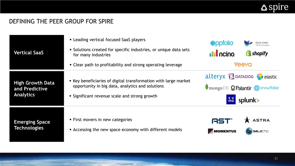 DEFINING THE PEER GROUP FOR SPIRE § Leading vertical focused SaaS players § Solutions created for specific industries, or unique data sets Vertical SaaS for many industries § Clear path to profitability and strong operating leverage § Key beneficiaries of digital transformation with large market High Growth Data opportunity in big data, analytics and solutions and Predictive Analytics § Significant revenue scale and strong growth § First movers in new categories Emerging Space Technologies § Accessing the new space economy with different models 31DEFINING THE PEER GROUP FOR SPIRE § Leading vertical focused SaaS players § Solutions created for specific industries, or unique data sets Vertical SaaS for many industries § Clear path to profitability and strong operating leverage § Key beneficiaries of digital transformation with large market High Growth Data opportunity in big data, analytics and solutions and Predictive Analytics § Significant revenue scale and strong growth § First movers in new categories Emerging Space Technologies § Accessing the new space economy with different models 31