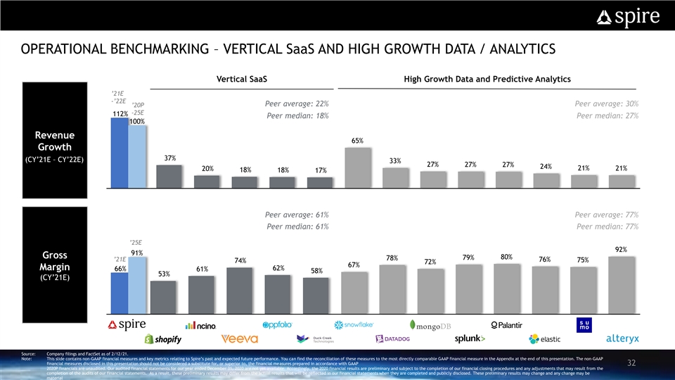 OPERATIONAL BENCHMARKING – VERTICAL SaaS AND HIGH GROWTH DATA / ANALYTICS Vertical SaaS High Growth Data and Predictive Analytics ’21E -’22E Peer average: 22% Peer average: 30% ’20P -25E 112% Peer median: 18% Peer median: 27% 100% Revenue 65% Growth 37% (CY’21E – CY’22E) 33% 27% 27% 27% 24% 21% 20% 21% 18% 18% 17% Peer average: 61% Peer average: 77% Peer median: 61% Peer median: 77% ’25E 92% 91% Gross 79% 80% 78% ’21E 76% 75% 74% 72% 67% Margin 62% 66% 61% 58% 53% (CY’21E) Source: Company filings and FactSet as of 2/12/21. Note: This slide contains non-GAAP financial measures and key metrics relating to Spire’s past and expected future performance. You can find the reconciliation of these measures to the most directly comparable GAAP financial measure in the Appendix at the end of this presentation. The non-GAAP financial measures disclosed in this presentation should not be considered a substitute for, or superior to, the financial measures prepared in accordance with GAAP 32 2020P financials are unaudited. Our audited financial statements for our year ended December 31, 2020 are not yet available. Accordingly, the 2020 financial results are preliminary and subject to the completion of our financial closing procedures and any adjustments that may result from the completion of the audits of our financial statements. As a result, these preliminary results may differ from the actual results that will be reflected in our financial statements when they are completed and publicly disclosed. These preliminary results may change and any change may be materialOPERATIONAL BENCHMARKING – VERTICAL SaaS AND HIGH GROWTH DATA / ANALYTICS Vertical SaaS High Growth Data and Predictive Analytics ’21E -’22E Peer average: 22% Peer average: 30% ’20P -25E 112% Peer median: 18% Peer median: 27% 100% Revenue 65% Growth 37% (CY’21E – CY’22E) 33% 27% 27% 27% 24% 21% 20% 21% 18% 18% 17% Peer average: 61% Peer average: 77% Peer median: 61% Peer median: 77% ’25E 92% 91% Gross 79% 80% 78% ’21E 76% 75% 74% 72% 67% Margin 62% 66% 61% 58% 53% (CY’21E) Source: Company filings and FactSet as of 2/12/21. Note: This slide contains non-GAAP financial measures and key metrics relating to Spire’s past and expected future performance. You can find the reconciliation of these measures to the most directly comparable GAAP financial measure in the Appendix at the end of this presentation. The non-GAAP financial measures disclosed in this presentation should not be considered a substitute for, or superior to, the financial measures prepared in accordance with GAAP 32 2020P financials are unaudited. Our audited financial statements for our year ended December 31, 2020 are not yet available. Accordingly, the 2020 financial results are preliminary and subject to the completion of our financial closing procedures and any adjustments that may result from the completion of the audits of our financial statements. As a result, these preliminary results may differ from the actual results that will be reflected in our financial statements when they are completed and publicly disclosed. These preliminary results may change and any change may be material