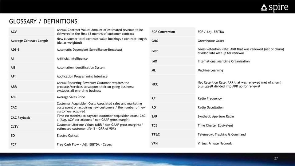 GLOSSARY / DEFINITIONS Annual Contract Value: Amount of estimated revenue to be ACV FCF Conversion FCF / Adj. EBITDA delivered in the first 12 months of customer contract New customer total contract value bookings / contract length Average Contract Length GHG Greenhouse Gases (dollar weighted) Gross Retention Rate: ARR that was renewed (net of churn) ADS-B Automatic Dependent Surveillance-Broadcast GRR divided into ARR up for renewal AI Artificial Intelligence IMO International Maritime Organization AIS Automation Identification System ML Machine Learning API Application Programming Interface Net Retention Rate: ARR that was renewed (net of churn) Annual Recurring Revenue: Customer requires the NRR plus upsell divided into ARR up for renewal ARR products/services to support their on-going business; excludes all one-time business ASP Average Sales Price RF Radio Frequency Customer Acquisition Cost: Associated sales and marketing CAC costs spent on acquiring new customers / the number of new RO Radio Occultation customers acquired Time (in months) to payback customer acquisition costs; CAC SAR Synthetic Aperture Radar CAC Payback / (Avg. ACV per account * non-GAAP gross margin) Customer Lifetime Value: (ARR * non-GAAP gross margins) * TCE Time Charter Equivalent CLTV estimated customer life (1 - GRR of 90%) TT&C Telemetry, Tracking & Command EO Electro Optical VPN Virtual Private Network FCF Free Cash Flow = Adj. EBITDA – Capex 37GLOSSARY / DEFINITIONS Annual Contract Value: Amount of estimated revenue to be ACV FCF Conversion FCF / Adj. EBITDA delivered in the first 12 months of customer contract New customer total contract value bookings / contract length Average Contract Length GHG Greenhouse Gases (dollar weighted) Gross Retention Rate: ARR that was renewed (net of churn) ADS-B Automatic Dependent Surveillance-Broadcast GRR divided into ARR up for renewal AI Artificial Intelligence IMO International Maritime Organization AIS Automation Identification System ML Machine Learning API Application Programming Interface Net Retention Rate: ARR that was renewed (net of churn) Annual Recurring Revenue: Customer requires the NRR plus upsell divided into ARR up for renewal ARR products/services to support their on-going business; excludes all one-time business ASP Average Sales Price RF Radio Frequency Customer Acquisition Cost: Associated sales and marketing CAC costs spent on acquiring new customers / the number of new RO Radio Occultation customers acquired Time (in months) to payback customer acquisition costs; CAC SAR Synthetic Aperture Radar CAC Payback / (Avg. ACV per account * non-GAAP gross margin) Customer Lifetime Value: (ARR * non-GAAP gross margins) * TCE Time Charter Equivalent CLTV estimated customer life (1 - GRR of 90%) TT&C Telemetry, Tracking & Command EO Electro Optical VPN Virtual Private Network FCF Free Cash Flow = Adj. EBITDA – Capex 37