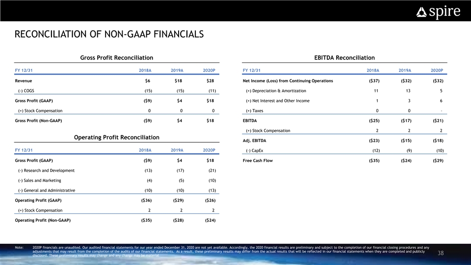SPIRE NON-GAAP FINANCIAL SUMMARY ($ in millions) FY 12/31 2018A 2019A 2020P 2021E 2022E 2023E 2024E 2025E ASP for ARR (in thousands) $262 $208 $235 $258 $310 $332 $370 $396 Total GAAP Revenue $6 $18 $28 $54 $114 $227 $478 $913 % growth 203% 54% 89% 112% 99% 111% 91% Gross Profit ($9) $4 $18 $35 $84 $186 $422 $830 % margin NM 20% 63% 66% 74% 82% 88% 91% (-) Research & Development ($12) ($17) ($20) ($28) ($40) ($55) ($96) ($146) (-) Sales & Marketing (4) (5) (10) (19) (32) (58) (105) (201) (-) General and Administrative (9) (10) (12) (14) (18) (23) (45) (91) Operating Profit ($35) ($28) ($24) ($26) ($5) $51 $175 $392 % margin 22% 37% 43% (+) D&A 11 13 5 8 11 16 22 33 Adj. EBITDA ($23) ($15) ($18) ($18) $6 $66 $198 $425 % margin 5% 29% 41% 47% (-) Capex (12) (9) (10) (16) (20) (25) (31) (68) Free Cash Flow (FCF) ($35) ($24) ($29) ($34) ($14) $41 $166 $357 % FCF conversion 62% 84% 84% Source: 2021 – 2025 Spire financials based on management projections Note: This slide contains non-GAAP financial measures and key metrics relating to Spire’s past and expected future performance. For historical periods, you can find the reconciliation of these measures to the most directly comparable GAAP financial measure in the Appendix at the end of this presentation. The non-GAAP financial measures disclosed in this presentation should not be considered a substitute for, or superior to, the financial measures prepared in accordance with GAAP 28 2020P financials are unaudited. Our audited financial statements for our year ended December 31, 2020 are not yet available. Accordingly, the 2020 financial results are preliminary and subject to the completion of our financial closing procedures and any adjustments that may result from the completion of the audits of our financial statements. As a result, these preliminary results may differ from the actual results that will be reflected in our financial statements when they are completed and publicly disclosed. These preliminary results may change and any change may be material FCF conversion defined as (Adj. EBITDA – Capex) / Adj. EBITDASPIRE NON-GAAP FINANCIAL SUMMARY ($ in millions) FY 12/31 2018A 2019A 2020P 2021E 2022E 2023E 2024E 2025E ASP for ARR (in thousands) $262 $208 $235 $258 $310 $332 $370 $396 Total GAAP Revenue $6 $18 $28 $54 $114 $227 $478 $913 % growth 203% 54% 89% 112% 99% 111% 91% Gross Profit ($9) $4 $18 $35 $84 $186 $422 $830 % margin NM 20% 63% 66% 74% 82% 88% 91% (-) Research & Development ($12) ($17) ($20) ($28) ($40) ($55) ($96) ($146) (-) Sales & Marketing (4) (5) (10) (19) (32) (58) (105) (201) (-) General and Administrative (9) (10) (12) (14) (18) (23) (45) (91) Operating Profit ($35) ($28) ($24) ($26) ($5) $51 $175 $392 % margin 22% 37% 43% (+) D&A 11 13 5 8 11 16 22 33 Adj. EBITDA ($23) ($15) ($18) ($18) $6 $66 $198 $425 % margin 5% 29% 41% 47% (-) Capex (12) (9) (10) (16) (20) (25) (31) (68) Free Cash Flow (FCF) ($35) ($24) ($29) ($34) ($14) $41 $166 $357 % FCF conversion 62% 84% 84% Source: 2021 – 2025 Spire financials based on management projections Note: This slide contains non-GAAP financial measures and key metrics relating to Spire’s past and expected future performance. For historical periods, you can find the reconciliation of these measures to the most directly comparable GAAP financial measure in the Appendix at the end of this presentation. The non-GAAP financial measures disclosed in this presentation should not be considered a substitute for, or superior to, the financial measures prepared in accordance with GAAP 28 2020P financials are unaudited. Our audited financial statements for our year ended December 31, 2020 are not yet available. Accordingly, the 2020 financial results are preliminary and subject to the completion of our financial closing procedures and any adjustments that may result from the completion of the audits of our financial statements. As a result, these preliminary results may differ from the actual results that will be reflected in our financial statements when they are completed and publicly disclosed. These preliminary results may change and any change may be material FCF conversion defined as (Adj. EBITDA – Capex) / Adj. EBITDA