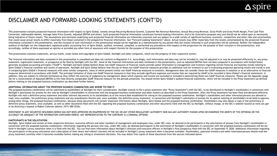 DISCLAIMER AND FORWARD–LOOKING STATEMENTS (CONT’D) DISCLAIMER AND FORWARD LOOKING STATEMENTS This presentation contains projected financial information with respect to Spire Global, namely Annual Recurring Revenue Growth, Customer Net Revenue Retention, Annual Recurring Revenue, Gross Profit and Gross Profit Margin, Free Cash Flow Conversion, Addressable Market, Average Sales Price Growth, Adjusted EBITDA and others. Such projected financial information constitutes forward-looking information, and is for illustrative purposes only and should not be relied upon as necessarily being indicative of future results. The assumptions and estimates underlying such projected financial information are inherently uncertain and are subject to a wide variety of significant business, economic, competitive and other risks and uncertainties that could cause actual results to differ materially from those contained in the prospective financial information. See “Forward-Looking Statements” above. Actual results may differ materially from the results contemplated by the projected financial information contained in this presentation, and the inclusion of such information in this presentation should not be regarded as a representation by any person that the results reflected in such projections will be achieved. Neither the independent auditors of NavSight nor the independent registered public accounting firm of Spire Global, audited, reviewed, compiled, or performed any procedures with respect to the projections for the purpose of their inclusion in this presentation, and accordingly, neither of them expressed an opinion or provided any other form of assurance with respect thereto for the purpose of this presentation. This presentation contains trademarks, service marks, trade names and copyrights of Spire Global, NavSight and other companies, which are the property of their respective owners. The financial information and data contained in this presentation is unaudited and does not conform to Regulation S-X. Accordingly, such information and data may not be included in, may be adjusted in or may be presented differently in, any proxy statement, registration statement, or prospectus to be filed by NavSight with the SEC. Some of the financial information and data contained in this presentation, such as Adjusted EBITDA have not been prepared in accordance with United States generally accepted accounting principles (“GAAP”). NavSight and Spire Global believe these non-GAAP measures of financial results provide useful information to management and investors regarding certain financial and business trends relating to Spire Global’s financial condition and results of operations. NavSight and Spire Global believe that the use of these non-GAAP financial measures provides an additional tool for investors to use in evaluating projected operating results and trends in and in comparing Spire Global’s financial measures with other similar companies, many of which present similar non-GAAP financial measures to investors. Management does not consider these non-GAAP measures in isolation or as an alternative to financial measures determined in accordance with GAAP. The principal limitation of these non-GAAP financial measures is that they exclude significant expenses and income that are required by GAAP to be recorded in Spire Global’s financial statements. In addition, they are subject to inherent limitations as they reflect the exercise of judgments by management about which expense and income are excluded or included in determining these non-GAAP financial measures. Please see the Appendix (page 36) for a reconciliation of Adjusted EBITDA to the most directly comparable GAAP financial measure for the periods presented. You should review Spire Global’s audited financial statements, which will be included in the Proxy Statement (as defined below) relating to the proposed business combination (as described further below). ADDITIONAL INFORMATION ABOUT THE PROPOSED BUSINESS COMBINATION AND WHERE TO FIND IT The proposed business combination will be submitted to stockholders of NavSight for their consideration. NavSight intends to file a proxy statement (the “Proxy Statement”) with the SEC, to be distributed to NavSight’s stockholders in connection with NavSight’s solicitation for proxies for the vote by NavSight’s shareholders in connection with the proposed business combination and other matters as described in the Proxy Statement. After the Proxy Statement has been filed and declared effective, NavSight will mail a definitive proxy statement and other relevant documents to its stockholders as of the record date established for voting on the proposed business combination. NavSight’s stockholders and other interested persons are advised to read, once available, the preliminary proxy statement and any amendments thereto and, once available, the definitive proxy statement, in connection with NavSight’s solicitation of proxies for its special meeting of stockholders to be held to approve, among other things, the proposed business combination, because these documents will contain important information about NavSight, Spire Global and the proposed business combination. Stockholders may also obtain a copy of the preliminary or definitive proxy statement, once available, as well as other documents filed with the SEC regarding the proposed business combination and other documents filed with the SEC by NavSight, without charge, at the SEC’s website located at www.sec.gov or by directing a request to Robert Coleman (phone: (571) 500-2236). INVESTMENT IN ANY SECURITIES DESCRIBED HEREIN HAS NOT BEEN APPROVED OR DISAPPROVED BY THE SEC OR ANY OTHER REGULATORY AUTHORITY NOR HAS ANY AUTHORITY PASSED UPON OR ENDORSED THE MERITS OF THE OFFERING OR THE ACCURACY OR ADEQUACY OF THE INFORMATION CONTAINED HEREIN. ANY REPRESENTATION TO THE CONTRARY IS A CRIMINAL OFFENSE. PARTICIPANTS IN THE SOLICITATION NavSight, 