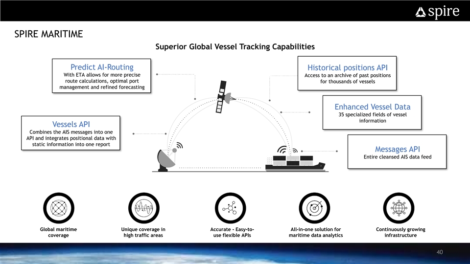 SPIRE MARITIME Superior Global Vessel Tracking Capabilities Predict AI-Routing Historical positions API With ETA allows for more precise Access to an archive of past positions route calculations, optimal port for thousands of vessels management and refined forecasting Enhanced Vessel Data 35 specialized fields of vessel information Vessels API Combines the AIS messages into one API and integrates positional data with static information into one report Messages API Entire cleansed AIS data feed Global maritime Unique coverage in Accurate - Easy-to- All-in-one solution for Continuously growing coverage high traffic areas use flexible APIs maritime data analytics infrastructure 40SPIRE MARITIME Superior Global Vessel Tracking Capabilities Predict AI-Routing Historical positions API With ETA allows for more precise Access to an archive of past positions route calculations, optimal port for thousands of vessels management and refined forecasting Enhanced Vessel Data 35 specialized fields of vessel information Vessels API Combines the AIS messages into one API and integrates positional data with static information into one report Messages API Entire cleansed AIS data feed Global maritime Unique coverage in Accurate - Easy-to- All-in-one solution for Continuously growing coverage high traffic areas use flexible APIs maritime data analytics infrastructure 40