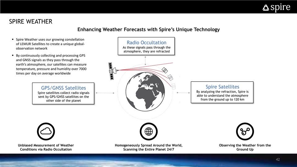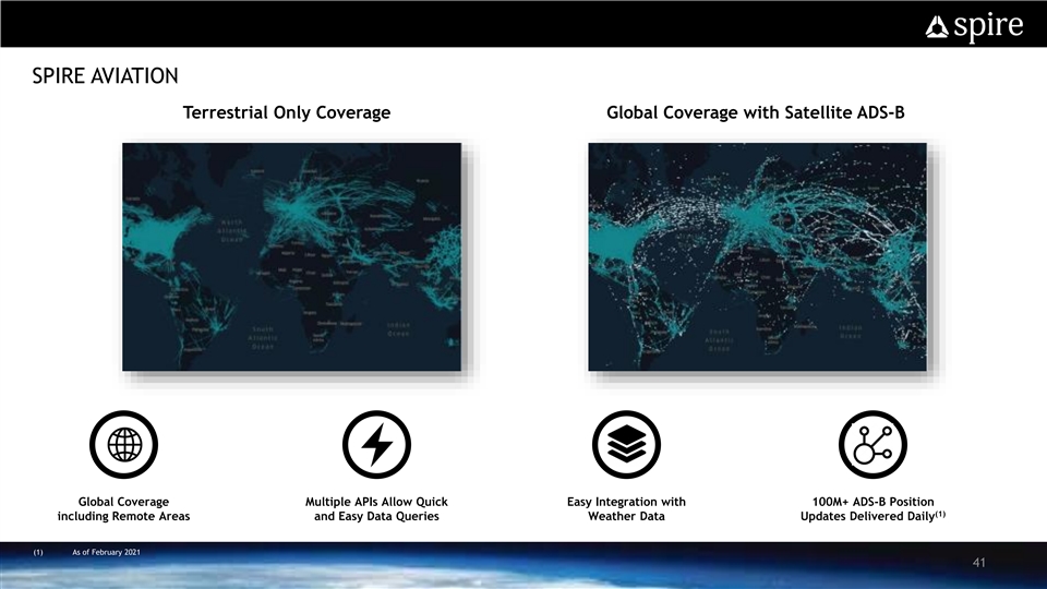SPIRE AVIATION Terrestrial Only Coverage Global Coverage with Satellite ADS-B Global Coverage Multiple APIs Allow Quick Easy Integration with 100M+ ADS-B Position (1) including Remote Areas and Easy Data Queries Weather Data Updates Delivered Daily (1) As of February 2021 41SPIRE AVIATION Terrestrial Only Coverage Global Coverage with Satellite ADS-B Global Coverage Multiple APIs Allow Quick Easy Integration with 100M+ ADS-B Position (1) including Remote Areas and Easy Data Queries Weather Data Updates Delivered Daily (1) As of February 2021 41