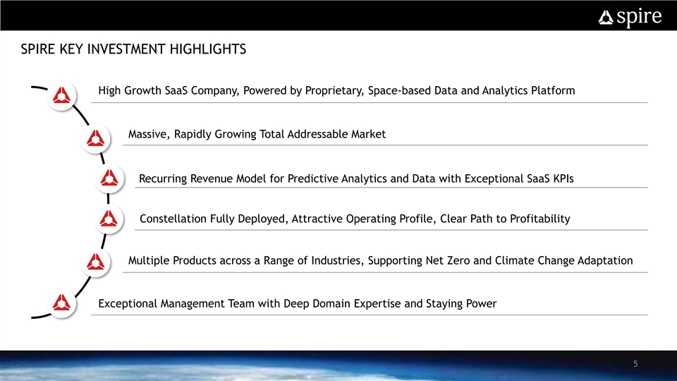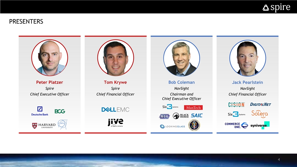 PRESENTERS Peter Platzer Tom Krywe Bob Coleman Jack Pearlstein Spire Spire NavSight NavSight Chief Executive Officer Chief Financial Officer Chairman and Chief Financial Officer Chief Executive Officer 4PRESENTERS Peter Platzer Tom Krywe Bob Coleman Jack Pearlstein Spire Spire NavSight NavSight Chief Executive Officer Chief Financial Officer Chairman and Chief Financial Officer Chief Executive Officer 4