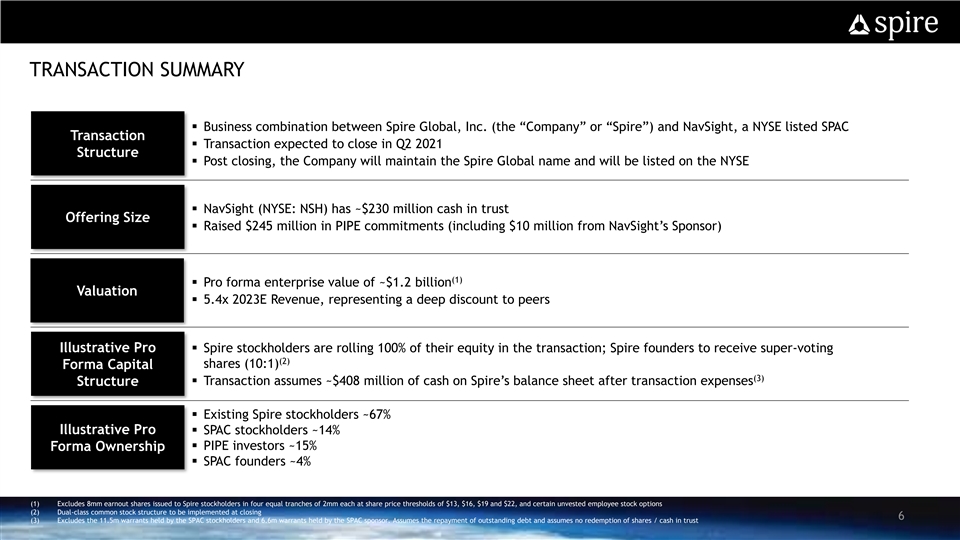 TRANSACTION SUMMARY DISCLAIMER AND FORWARD LOOKING STATEMENTS § Business combination between Spire Global, Inc. (the “Company” or “Spire”) and NavSight, a NYSE listed SPAC Transaction § Transaction expected to close in Q2 2021 Structure § Post closing, the Company will maintain the Spire Global name and will be listed on the NYSE § NavSight (NYSE: NSH) has ~$230 million cash in trust Offering Size § Raised $245 million in PIPE commitments (including $10 million from NavSight’s Sponsor) (1) § Pro forma enterprise value of ~$1.2 billion Valuation § 5.4x 2023E Revenue, representing a deep discount to peers Illustrative Pro § Spire stockholders are rolling 100% of their equity in the transaction; Spire founders to receive super-voting (2) shares (10:1) Forma Capital (3) § Transaction assumes ~$408 million of cash on Spire’s balance sheet after transaction expenses Structure § Existing Spire stockholders ~67% Illustrative Pro § SPAC stockholders ~14% § PIPE investors ~15% Forma Ownership § SPAC founders ~4% (1) Excludes 8mm earnout shares issued to Spire stockholders in four equal tranches of 2mm each at share price thresholds of $13, $16, $19 and $22, and certain unvested employee stock options (2) Dual-class common stock structure to be implemented at closing 6 (3) Excludes the 11.5m warrants held by the SPAC stockholders and 6.6m warrants held by the SPAC sponsor. Assumes the repayment of outstanding debt and assumes no redemption of shares / cash in trustTRANSACTION SUMMARY DISCLAIMER AND FORWARD LOOKING STATEMENTS § Business combination between Spire Global, Inc. (the “Company” or “Spire”) and NavSight, a NYSE listed SPAC Transaction § Transaction expected to close in Q2 2021 Structure § Post closing, the Company will maintain the Spire Global name and will be listed on the NYSE § NavSight (NYSE: NSH) has ~$230 million cash in trust Offering Size § Raised $245 million in PIPE commitments (including $10 million from NavSight’s Sponsor) (1) § Pro forma enterprise value of ~$1.2 billion Valuation § 5.4x 2023E Revenue, representing a deep discount to peers Illustrative Pro § Spire stockholders are rolling 100% of their equity in the transaction; Spire founders to receive super-voting (2) shares (10:1) Forma Capital (3) § Transaction assumes ~$408 million of cash on Spire’s balance sheet after transaction expenses Structure § Existing Spire stockholders ~67% Illustrative Pro § SPAC stockholders ~14% § PIPE investors ~15% Forma Ownership § SPAC founders ~4% (1) Excludes 8mm earnout shares issued to Spire stockholders in four equal tranches of 2mm each at share price thresholds of $13, $16, $19 and $22, and certain unvested employee stock options (2) Dual-class common stock structure to be implemented at closing 6 (3) Excludes the 11.5m warrants held by the SPAC stockholders and 6.6m warrants held by the SPAC sponsor. Assumes the repayment of outstanding debt and assumes no redemption of shares / cash in trust