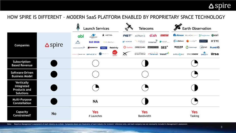 HOW SPIRE IS DIFFERENT – MODERN SaaS PLATFORM ENABLED BY PROPRIETARY SPACE TECHNOLOGY DISCLAIMER AND FORWARD LOOKING STATEMENTS Launch Services Telecoms Earth Observation Companies Subscription- Based Revenue Software-Driven Business Model Vertically Integrated Products and Solutions Multi-Purpose NA Constellation Capacity Yes Yes Yes No Constrained? # Launches Bandwidth Tasking Note: Based on Management’s assessment of each industry as a whole. Companies shown are illustrative of each industry for investors’ reference only, and each company was not necessarily included in Management’s assessment 8HOW SPIRE IS DIFFERENT – MODERN SaaS PLATFORM ENABLED BY PROPRIETARY SPACE TECHNOLOGY DISCLAIMER AND FORWARD LOOKING STATEMENTS Launch Services Telecoms Earth Observation Companies Subscription- Based Revenue Software-Driven Business Model Vertically Integrated Products and Solutions Multi-Purpose NA Constellation Capacity Yes Yes Yes No Constrained? # Launches Bandwidth Tasking Note: Based on Management’s assessment of each industry as a whole. Companies shown are illustrative of each industry for investors’ reference only, and each company was not necessarily included in Management’s assessment 8